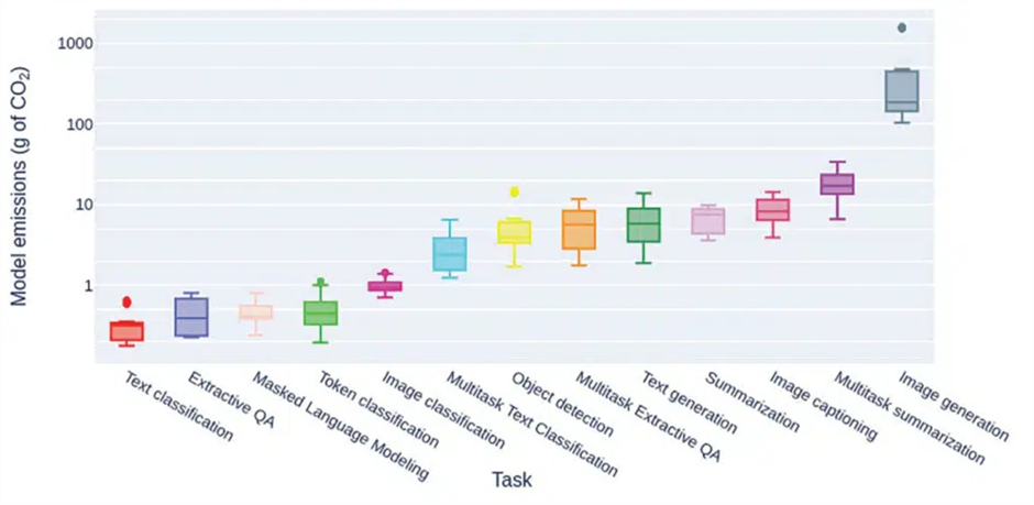 BLOOM is the world’s largest open multilingual LLM. Scientists have estimated that training the BLOOM AI model emits roughly 10 times more greenhouse gases than the average French citizen in an entire year. Of course, more complex queries or requests lead to more energy consumption. Generating an image is far more energy intensive than an image classification, for example. The chart below illustrates the variance in energy consumption to tasks.
