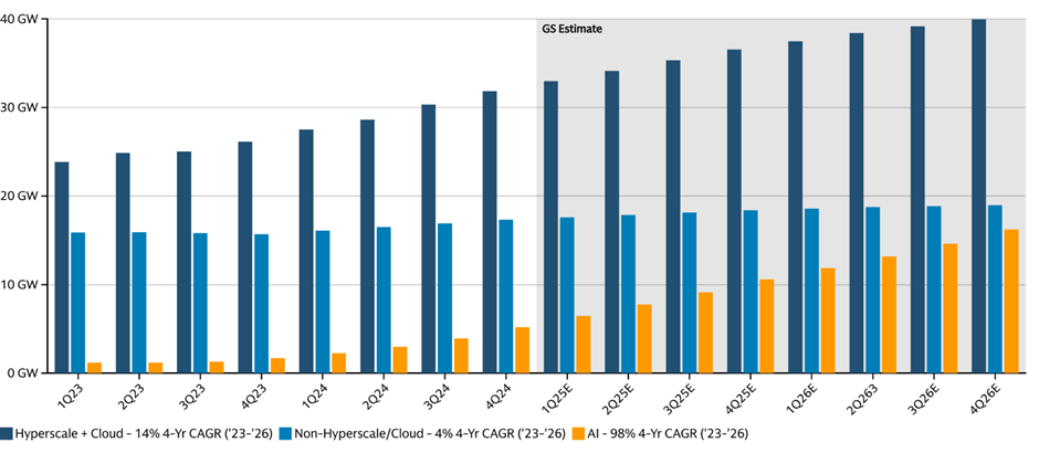 Source : Étude Goldman Sachs, « Comment l'IA transforme les centres de données et fait exploser la demande en énergie ». https://www.goldmansachs.com/insights/articles/how-ai-is-transforming-data-centers-and-ramping-up-power-demand