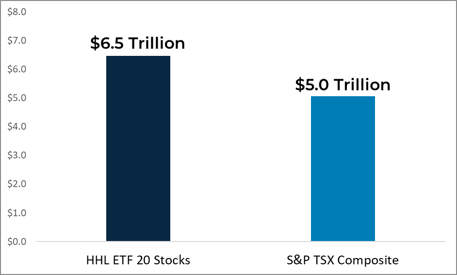 Capitalisation boursière de 20 actions de HHL (en dollars canadiens) par rapport à l'indice composé S&P/TSX