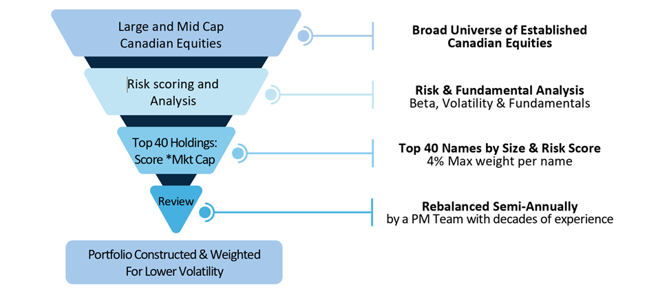 The Harvest Low Volatility Canadian Equity ETF (TSX: HVOL)holds 40 top Canadian equities. These equities are ranked and weighted by their risk score and market cap weight, with a 4% maximum weight per name. The portfolio’s equities are scored according to risk and fundamental metrics. These include risk analysis, Beta – a risk metric that measures an investment’s sensitivity to fluctuations in the broader market, volatility, and implied volatility – a measure derived from options pricing that represents expected future volatility.