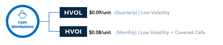 Below are the cash distributions that have been paid out from these respective low volatility ETFs. HVOL seeks to pay a quarterly distribution, last delivering a payout of $0.09 per unit to those holding the ETF. HVOI has delivered a monthly cash distribution of $0.08 per unit since its inception.